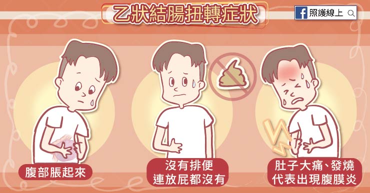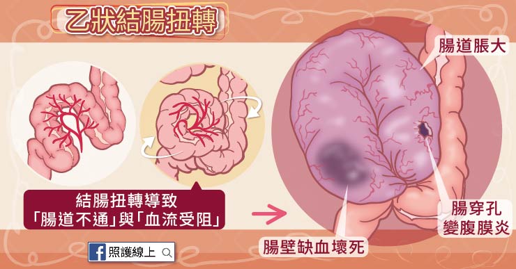 所以乙狀結腸扭轉會影響到兩件事:一是讓腸道變成「此路不通」;二是會讓血流受阻,腸道壞死。