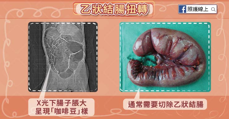 到醫院後醫師會試著用X光、電腦斷層等方式找到患者腸道阻塞或腹膜炎的原因,典型的乙狀結腸扭轉於X光下,脹大的結腸會看起來像咖啡豆的模樣。我們需要趕緊選用輸液補充,維持患者血壓平穩。用鼻胃管可舒緩一些腸胃道內的積液和壓力。