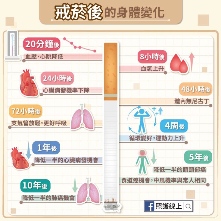你可能會說:「這裡只有說到心血管,那其他的器官呢?罹患癌症的機率呢?戒菸會有好處嗎?」對已經尼古丁成癮的人而言,或多或少都飄過「戒菸」的念頭,但總怕「不值得」。我們接下來再看看幾個戒菸後的身體變化。你會發現,戒菸的好處比想像中來的快!
