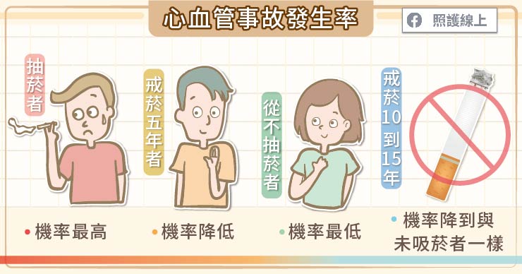 結果發現,戒菸者於戒菸五年後,與繼續抽菸者相比的話,罹患心血管疾病的機會大幅降低。也就是說,繼續抽菸,心臟病發的機會高很多;戒菸五年之後是能降低心血管疾病發作的。所以,千萬不要想說「來不及了啦」,只要能戒掉,還是帶來一些好處。