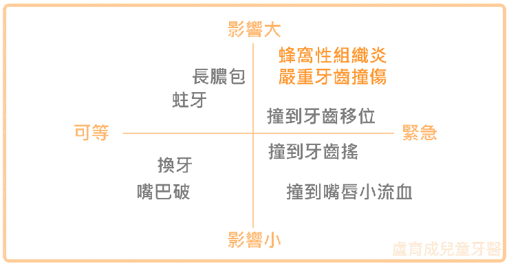 最嚴重的,是可能類似車禍那樣的強烈撞傷,不只是牙齒,可能甚至連嘴巴的骨頭都有狀況,也可能有血流不止的情形,這種情況我相信大家都不會乖乖在家等,建議直接坐上救護車前往醫院急診,一刻都不要等。