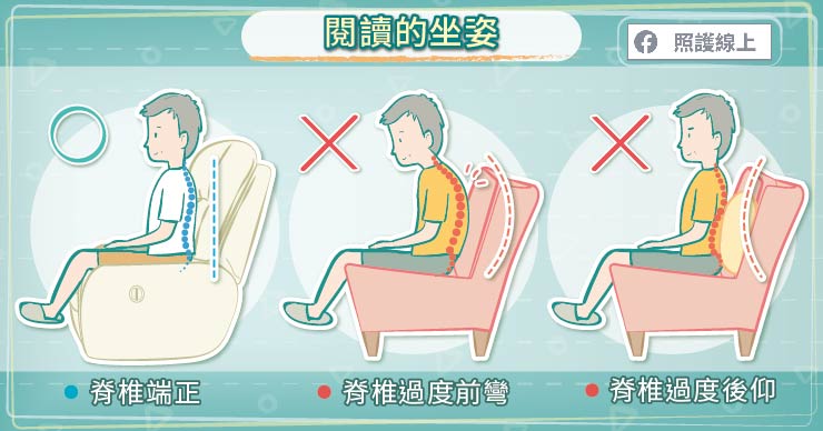 坐著閱讀、聊天時最好能維持脊椎端正,姿態優良也最為舒適。過度前彎不但影響脊椎,還會壓迫腹部臟器。