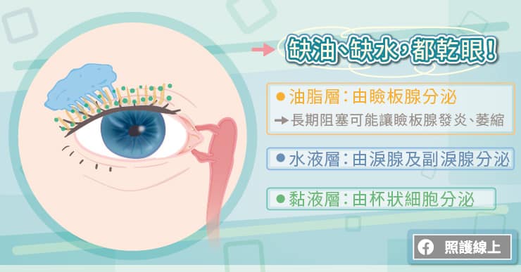 缺油型:若瞼板腺阻塞、萎縮,導致油脂分泌異常,淚液缺少油脂層,而使水分快速蒸發。瞼板腺是長條形線體,開口在睫毛根部附近,其分泌的油脂一般會在眨眼時排出並分布於淚液表層。正常時候,我們的眼睛每分鐘會眨15~20次,但當我們緊盯螢幕、手機時,眨眼頻率不自覺地下降,影響油脂的排出。瞼板腺開口阻塞,可能導致瞼板腺發炎、萎縮,乾眼症狀會愈來愈嚴重。