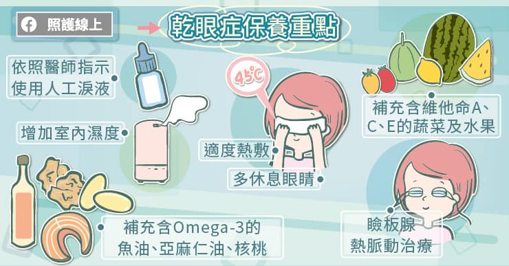 3. 飲食方面,可適量補充含Omega-3的魚油、亞麻仁油、核桃,這些屬於不飽和脂肪酸。同時,記得多攝取含維他命A、C、E的蔬菜及水果,也會有幫助。