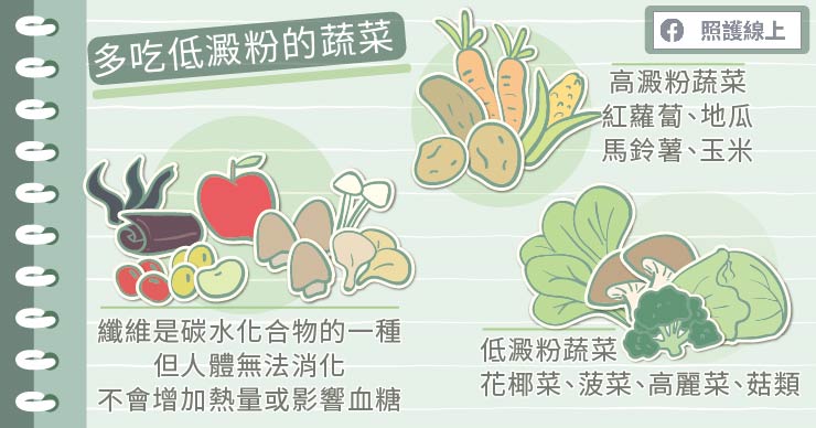 澱粉類比較高的植物通常是根莖類,像紅蘿蔔、地瓜、馬鈴薯、玉米、甜菜等,澱粉就比較多。如果你想吃地瓜或馬鈴薯,記得把它們算在主食那一類。那哪些是應該多吃的低澱粉蔬菜呢?大家常吃的花椰菜(青色與白色都是)、菠菜、高麗菜、蘆筍、菇類、萵苣等等都是!