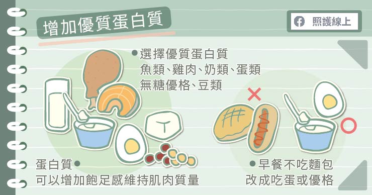 魚類、雞肉、奶類、蛋類、無糖優格、豆類等食物,都是優質蛋白質的選擇,記得每一餐都至少選擇一份來添加。
