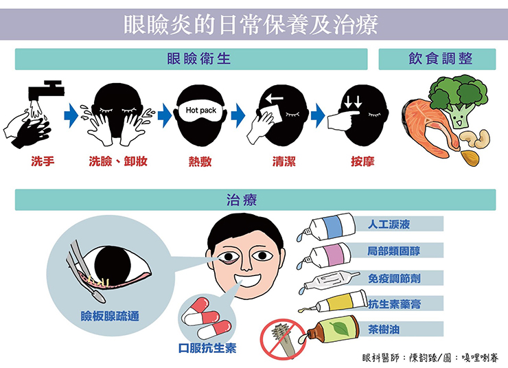 治療眼瞼炎的第一步是眼瞼衛生,包括眼瞼熱敷、清潔、按摩。