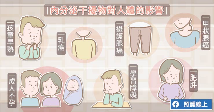 環境荷爾蒙會打擾器官間的訊息傳遞,讓人在神經系統、生殖系統、免疫系統、及生長發育方面受到阻礙。生殖器官的異常、孩童早熟、成人不孕,可能都與這些內分泌干擾物有關。且環境荷爾蒙會影響到神經系統,亦會引發學習障礙,注意力缺乏,大腦認知功能困難。內分泌干擾物也與幾個內分泌系統的癌症相關,像是乳癌、攝護腺癌、甲狀腺癌。甚至,現代人的健康大敵–肥胖,也與環境荷爾蒙的累積有關。