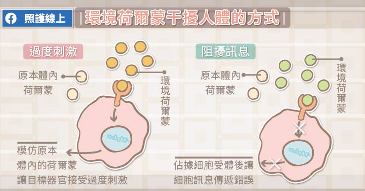外來的化學物質可能與細胞的受體結合,反倒讓正常荷爾蒙無法與細胞結合,細胞就無法接收到正確的訊息,而會改變、影響到身體機能,影響新陳代謝。
