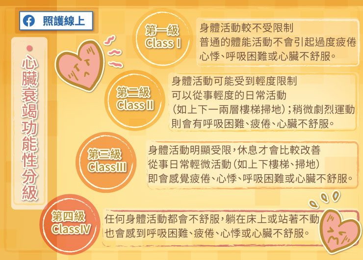 黃世忠醫師表示,美國紐約心臟學會把心臟衰竭分成四個等級,這是依照身體活動會不會受到限制來分級。