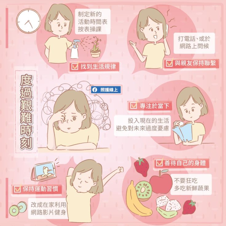 改變行為的部分,也都是為了現在的每一天來做考量。例如你過去非常忙碌,現在卻開始在家工作,或在居家檢疫自我隔離。那就改變行為讓自己每天盡量睡飽,花七到九小時的時間睡覺,並要求自己睡前半小時到一小時不要碰3C產品,提高睡眠品質,就是一個不錯的選擇。在家時間變長後,你也可以開始寫日記,用語音、文字、影像紀錄下自己的心得,正視自己最近的感受與反應。你可以上網找一些網路教學課程,重拾過往的喜好興趣,並趁機讓自己工作技能往上升級。當我們最好不要約朋友、親戚出門聚餐後,你仍舊可以透過電話、簡訊、電子郵件或社交媒體等方式,繼續與親朋好友交流意見,聯繫各項需求,讓自己保持參與眾人的感覺。當然,請不要在群組中惡意散佈不實資訊,或轉發來源不明的消息,這可是會受罰的!