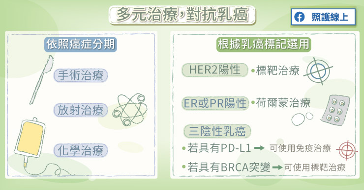 近年來乳癌發生率逐漸上升,乳癌的治療選項也愈來愈多元,高雄市立小港醫院外科主任莊捷翰醫師表示,確定診斷後醫師會根據癌症分期與患者的期望來擬定治療策略,總體來說乳癌的治療方式包括手術治療、化學治療、放射治療、標靶治療、免疫治療、荷爾蒙治療。
