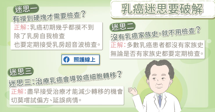 正解:台灣每年新增一萬三千多例乳癌,三、四十歲的患者相當多,大多數患者沒有乳癌家族史,所以無論是否有家族史都要定期檢查。