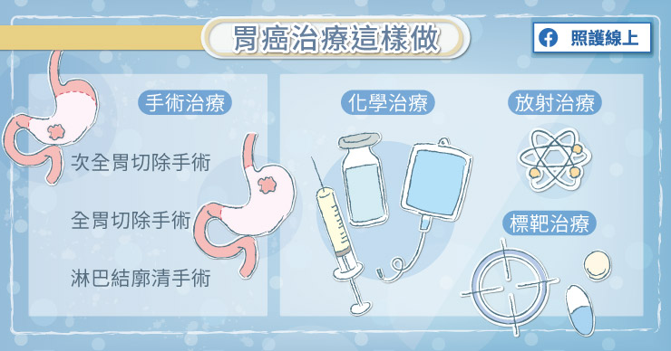 台灣癌症全人關懷基金會董事長謝瑞坤醫師指出,胃癌治療的原則是以手術治療為優先,在評估患者狀況、影像檢查後,能夠透過手術切除病灶的患者,會建議接受手術治療。若視腫瘤情況無法動手術,就會先進行化學治療,待腫瘤縮小後,再評估手術切除的可能性。