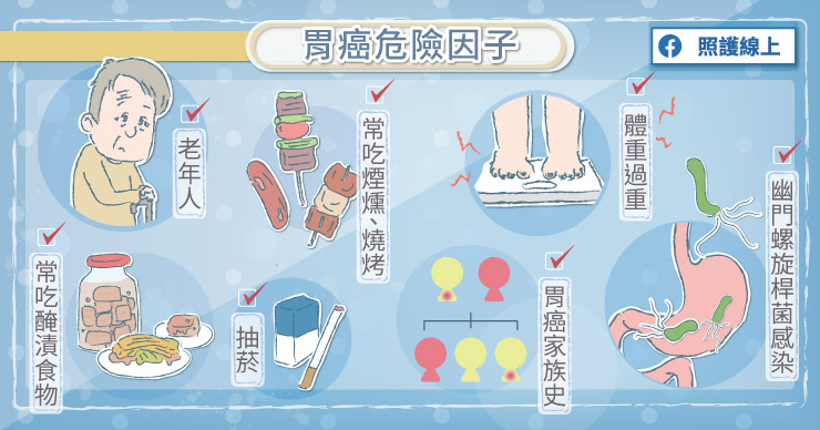 謝瑞坤醫師表示,胃癌的危險因子有部分與飲食有關,根據研究顯示醃漬、煙燻食物可能增加胃癌的發生率。另一個危險因子是幽門螺旋桿菌,研究發現幽門螺旋桿菌會導致胃潰瘍,長期感染則會增加癌症的發生率。