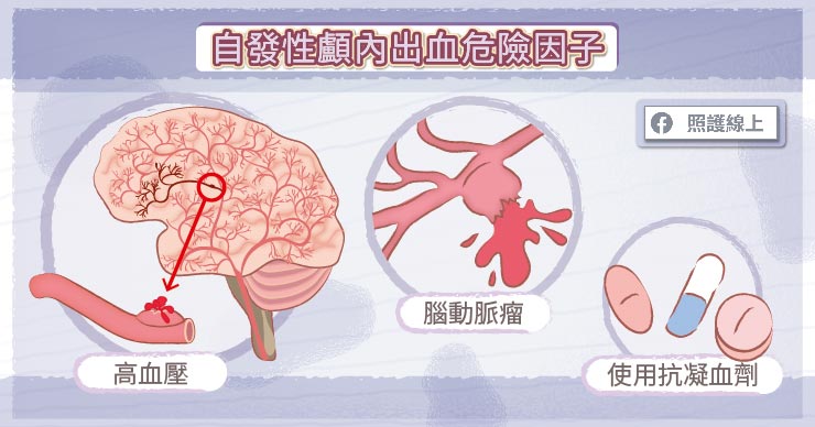 自發性顱內出血起因於血壓過高,或血管過於脆弱,而讓腦內血管破裂出血。最常見的原因是「高血壓」。尤其是對高血壓置之不理,沒好好用藥物控制血壓的人,是有可能出現這種問題的。另外幾個腦內血管的變化,像是腦動脈瘤、大腦類澱粉血管病變、海綿狀血管瘤、血管炎、甚至腦瘤都有可能造成顱內自發性腦出血。假使患者本身有使用抗凝血劑,或有血小板過低等其他容易出血的血液疾病,也比較容易會出現自發性顱內出血。