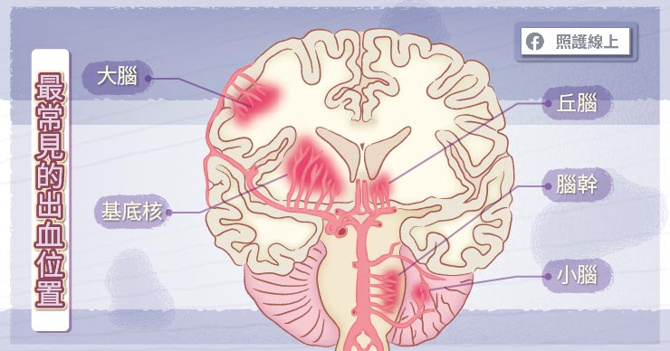 自發性顱內出血時,最常見的出血位置包括大腦、基底核、丘腦、腦幹、和小腦等位置。剛開始出血位置不同,會影響到初期的神經學症狀表現的不同。