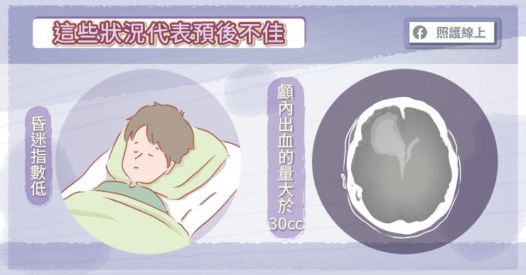 大家最關心的問題是,這樣的患者到底「回得來」嗎?患者的預後會與剛出現症狀時的神經學變化和電腦斷層結果有關。假使一開始昏迷指數愈低,也就是人叫不醒、遇到痛也不太動,就不是好現象。若電腦斷層的結果發現顱內出血的量超過30立方公分,或有腦室間出血,也代表著預後較差。