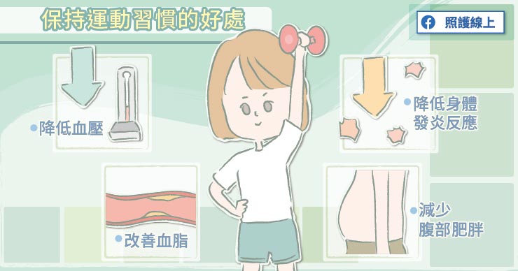 這裡說的身體活動是指除了工作的活動之外,是否有多出健身的時間,每星期從事2.5小時中等程度的運動,或每星期1.25小時的激烈運動。透過中等程度的運動或激烈活動,能夠帶來降低血壓、降低身體發炎反應、減少腹部肥胖、增加胰島素敏感性、以及改善血脂等好處,比起不運動或動得太少的人來的健康,所以大家請務必要養成規律的運動習慣。假使不方便出門運動,在家也要動起來。