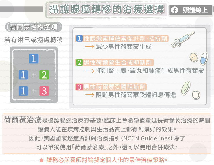 在台灣有不少患者在發現攝護腺癌時,已經有淋巴或遠處轉移的狀況,全身性荷爾蒙治療便是非常重要的治療方式。醫師可能會使用「性腺激素釋放素促進劑、拮抗劑」搭配「男性荷爾蒙生合成抑制劑」來抑制男性荷爾蒙生成,或加上「男性荷爾蒙受體阻斷劑」。