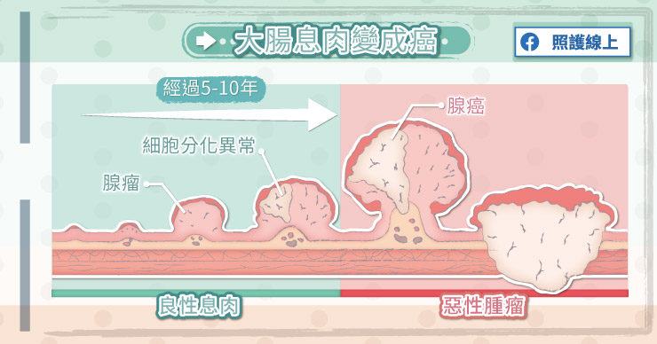 謝孟書醫師指出,大腸息肉很常見,分成很多種型態,其中較需留意的是「腺瘤」,因腺瘤會逐漸長大,經過幾年後可能出現病變,而演變成癌症。