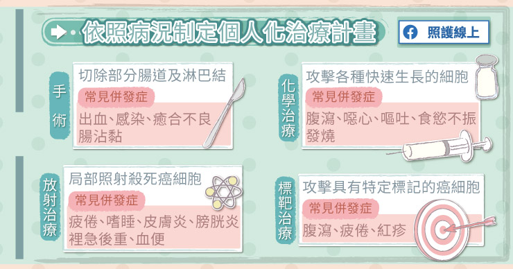 謝孟書醫師解釋,大腸癌的治療通常以癌症分期來進行,包括手術治療、化學治療、放射治療等,這幾個選項會互相搭配。有時先進行手術,術後再依照病理報告來決定是否加上化學治療和放射治療。