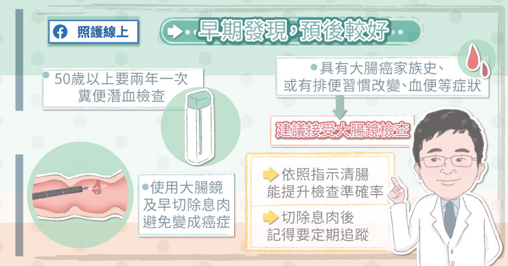 站在胃腸科醫師的立場,我們鼓勵患者做大腸鏡檢查。早期發現大腸癌,患者預後會比較好,早期的大腸息肉幾乎都沒有症狀,唯有大腸鏡才有機會發現息肉並能加以切除,更能避免演變成大腸癌。