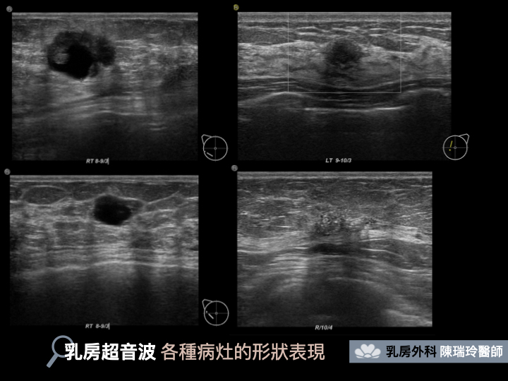 乳房超音波是利用手持探頭在皮膚上滑動,利用聲納的原理接收反彈回音成像;在操作過程中,醫師或專業的技術員可以利用各種不同的角度移動探頭,對於腫瘤、腺瘤、囊腫等病灶,可以得到很具體的形狀、大小、立體概念、相對位置等資訊。一般女性對於超音波想必不陌生,像是懷孕時婦產科醫師會利用超音波檢查寶寶的身體狀況,正是利用超音波在立體構造的強項,連幾隻手指頭、有沒有小雞雞都看得出來!而且音波不是放射線,沒有接觸劑量累積可能造成的疑慮,更不會有擠壓乳房造成的疼痛問題,是一個非常方便且直接的檢查方式。