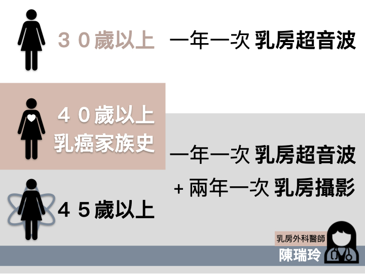 以健康促進和疾病預防的角度來說,我們會建議30歲以上的女性,每年一次乳房超音波檢查;對於40歲以上有家族乳癌病史的高危群、或是45歲以上的女性,則需要再加做兩年一次乳房攝影,增加篩檢的敏感度,補足某些無法被超音波看到的可能病灶。再加上專業醫師的諮詢,以及您的配合定期持續追蹤,這才是完整的乳房健康檢查。