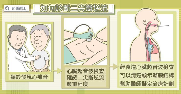 醫師會安排心臟超音波,心臟超音波可以確定二尖瓣膜逆流的嚴重度,分辨屬於退化性、還是功能性二尖瓣膜逆流。