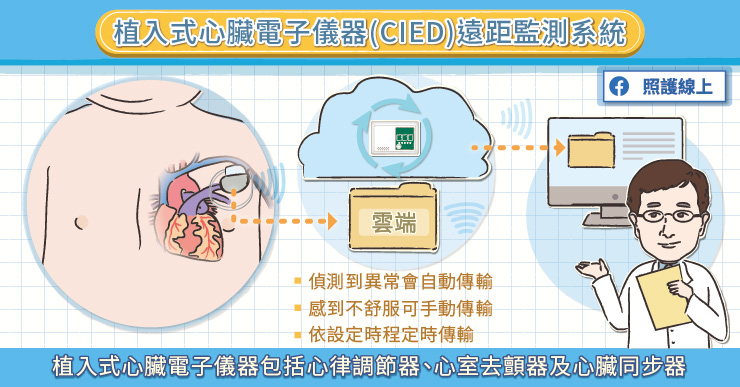 台大醫院心臟血管內科賀立婷醫師指出,如果患者裝設的植入式心臟電子儀器能夠遠距監控,就能跟遠距醫療中心合作。患者家裡面會裝置一台遠距上傳的傳輸器,自動每日搜尋異常警示或依據設定時程傳輸將資料上傳到遠距中心。