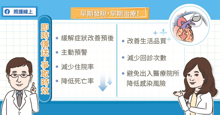 劉言彬醫師道,植入式心臟電子儀器遠距監測系統可在不影響病人安全情況下,減少患者回診次數,及早發現病況改變,縮短調整醫療決策所需的時間,做到早期發現、早期治療、而減少住院次數。針對放置心室去顫器的病患,遠距監測系統能提供早期主動式預警,可提早請病患回院調整設定,進而有效減少患者被電擊去顫的次數、降低住院天數,且能延長儀器使用年限等。根據大型研究,有植入式心臟電子儀器遠距監測系統,能夠改善預後並且降低死亡率。