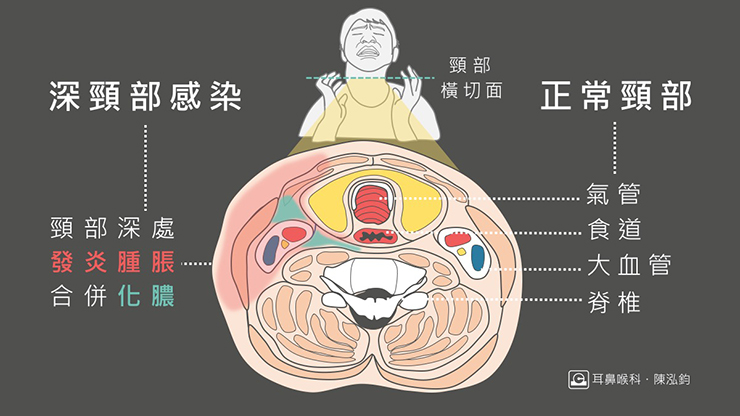「因為我們的頸部深處就是喉嚨跟呼吸道,如果感染發炎的話,就可能往內造成喉嚨發炎腫脹,甚至上呼吸道阻塞,有些人甚至需要插管或氣切呢!」