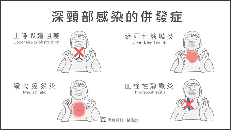 • 深頸部感染的併發症族繁不及備載,而且都很嚴重甚至致命!例如上呼吸道阻塞、縱隔腔感染、壞死性筋膜炎、頸靜脈栓塞、骨髓炎、嚴重敗血症…等等。