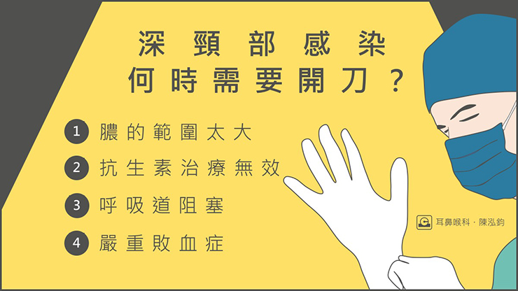 「不過,如果膿擴散到一個以上的頸部空間、膿的範圍太大(直徑超過 3 公分)、抗生素治療 48 小時沒有改善、發炎腫脹已嚴重威脅呼吸道,以及有嚴重敗血症的話,就建議開刀引流了。有些嚴重的狀況,可能還需要反覆多次開刀清創,才能將感染源清除乾淨。」