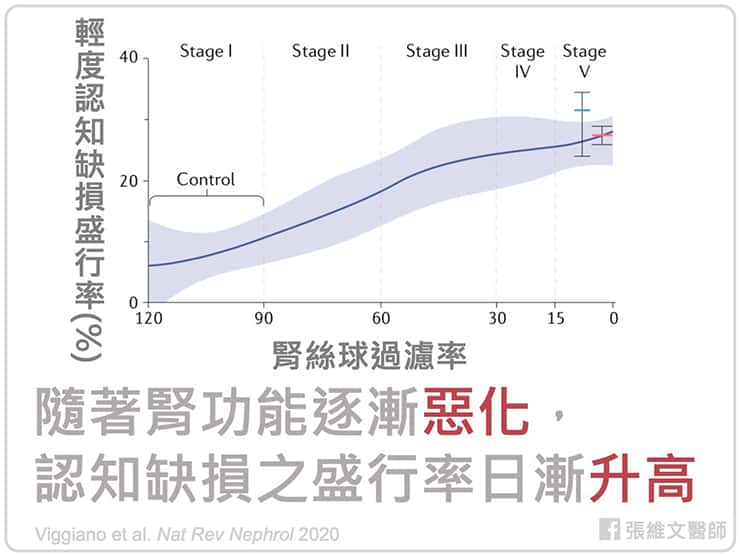 輕度認知障礙在一般族群的盛行率約是 11~26%,然而在慢性腎臟病第一期至第四期的患者中,盛行率高達 27~62%。