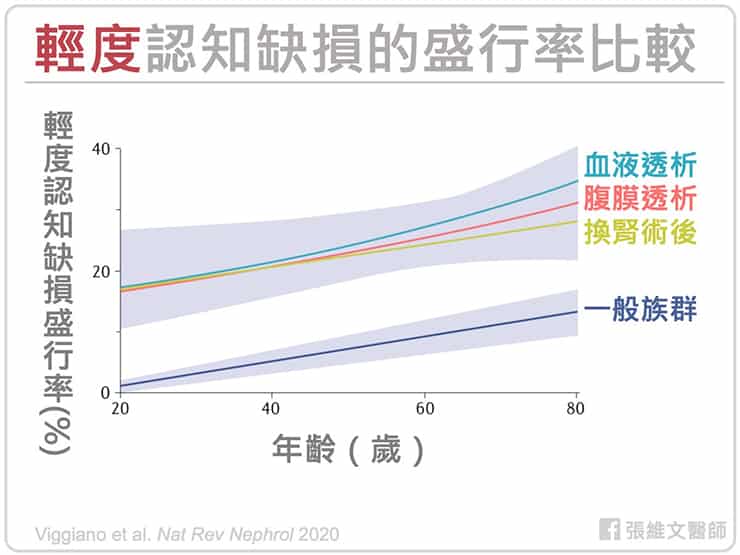 尤其是因嚴重腎衰竭至末期腎病,而需長期接受透析治療的腎友,出現認知功能障礙的盛行率最高;且不管是在各年齡層,腦力變差的盛行率皆明顯高於一般族群。