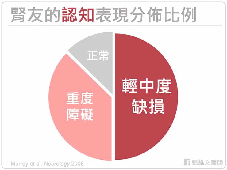 有一個關於 374 位血液透析病患的研究發現,僅 13% 患者的認知功能正常,將近 50% 的洗腎病人有輕中度之認知障礙,有 37% 的人具重度認知障礙。