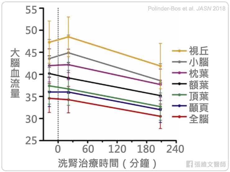 許多針對透析患者的功能性腦部影像都發現,在洗腎過程中,大腦各區域的血流量平均下降約 10%;若脫水量愈高,腦部血流量下降得愈多。腦部核磁共振影像也指出,腦部血流量下降愈多者,大腦白質愈易出現病變,臨床上的認知表現也較差。