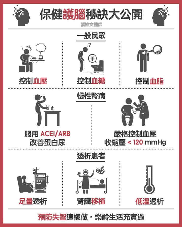 目前的相關研究結果指出,把血壓、血糖、血脂控制好,使用 ACEi/ARB 這類藥物來治療蛋白尿,甚至換腎,可預防或延緩腦力退化。