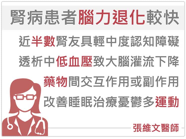 和一般大眾相比,慢性腎臟病患的腦力退化得更快,尤其是接受常規透析的老年病患,更是高危險群。