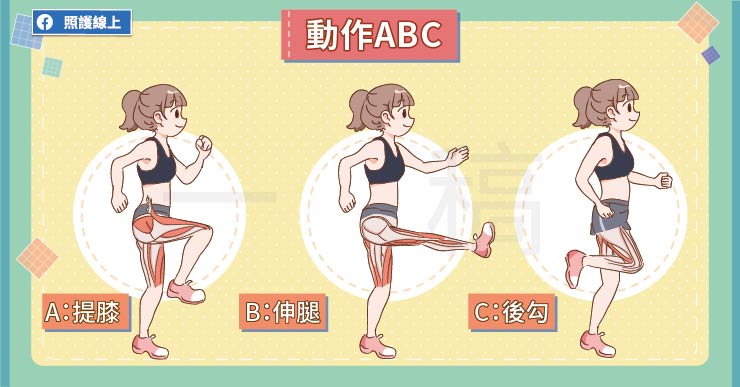 C是「後勾」,抬腿起來時,後腳跟要踢到屁股。動作都是左右交替做,同時手臂要自然擺動。