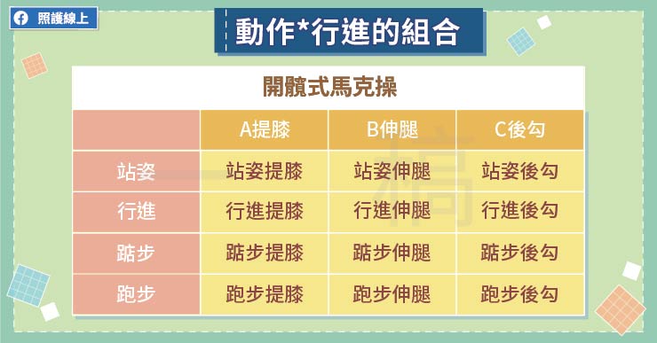 練習這幾個動作時,依舊可以循序練習立定、行進、踮步等不同行進方式,若覺得每一步都要做一個動作太過困難,行進間可以改成「三步一動作」,例如踏步左–右–左,用右側髖畫圓,右–左–右,用左側髖畫圓,這樣的步調。
