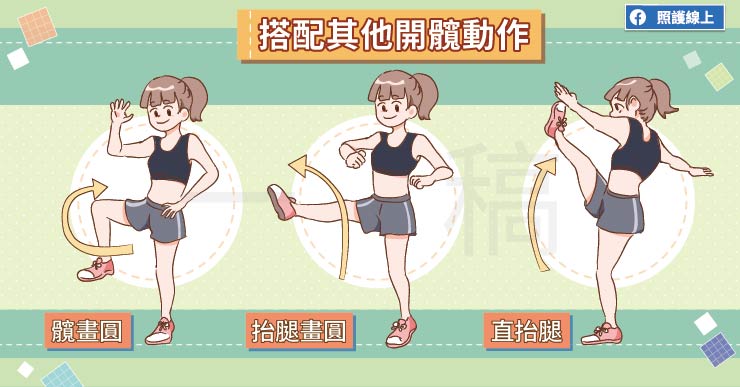 「抬腿畫圓」是用伸直腿後由內往外畫圓,也可以由外往內畫圓,鍛鍊不同肌群。