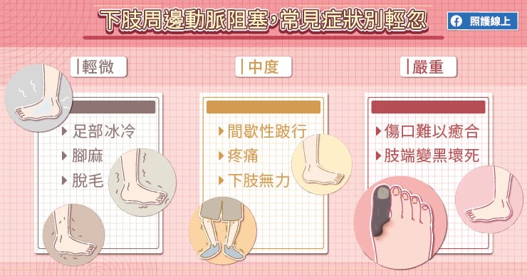 黃柏森醫師解釋,除了足部冰冷、腳麻以外,下肢血管阻塞進展到中度時會以「間歇性跛行」來表現,也就是在行走一段距離後便感到腿部痠麻、疼痛、無力,必須停下來休息才能繼續行走。隨著疾病惡化,行走距離將愈來愈短。尤其是天氣較冷的時候,血管收縮,這些症狀會更加明顯。