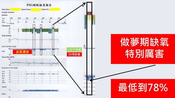 我們看到這個病人的睡眠循環雖然有好多次,也都能夠進入做夢期,也就是紅色的部分,但是比對下來,我們發現他在做夢期的時候缺氧的程度最厲害!在快速動眼期的紅框框之中,也穿插了很多白線或黃線,就表示這個病人的腦波顯示他做夢做到一半就醒過來,或是夢的斷斷續續的。如果作夢的時候常常會醒過來。那麼他就會覺得晚上睡覺的時候做了很多夢!