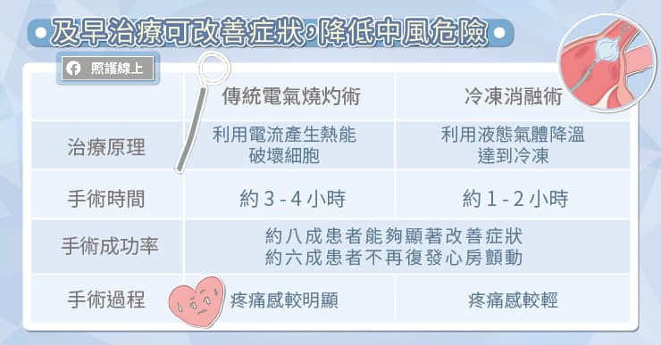 傳統電燒與冷凍消融的成功率相當,做完後有八成的患者能顯著改善症狀,有六成的患者不再復發心房顫動。