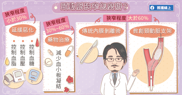 當頸動脈狹窄程度超過60%,且有頸動脈狹窄造成的視力黑矇、暈眩等症狀;或沒有症狀但頸動脈狹窄超過70%,可以選擇傳統內膜剝離手術或微創頸動脈支架進行治療,預防中風的發生。