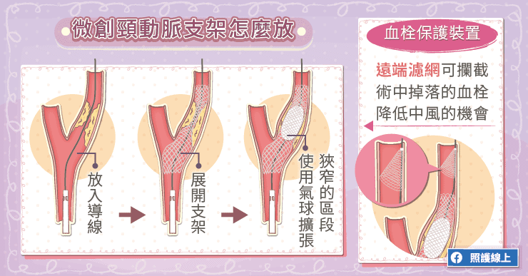 在放置支架時,為了預防在操作過程中的血塊掉落,醫師會運用更精細的導管設計。其中一種方法稱為「遠端濾網」,是在導管的遠端打開一個網孔很密的保護傘,讓血液流得過去,但是當斑塊剝落掉下,這個遠端濾網就能及時攔截,不讓剝落的斑塊往大腦流過去。待頸動脈支架操作完畢後,再回收遠端濾網即可。