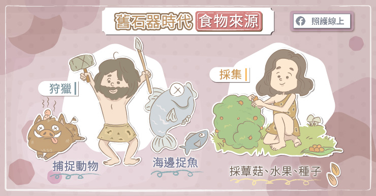 哪些算是「舊石器時代可以選擇的食物」呢?如果出發去狩獵,原始人可以吃到各種肉類,生活於海邊的人類會捕捉魚類,因此肉類和魚類都可以吃。另外則是一些野外的天然食材,像是水果、蔬菜、堅果、種子,這些都能靠著採集而獲得。